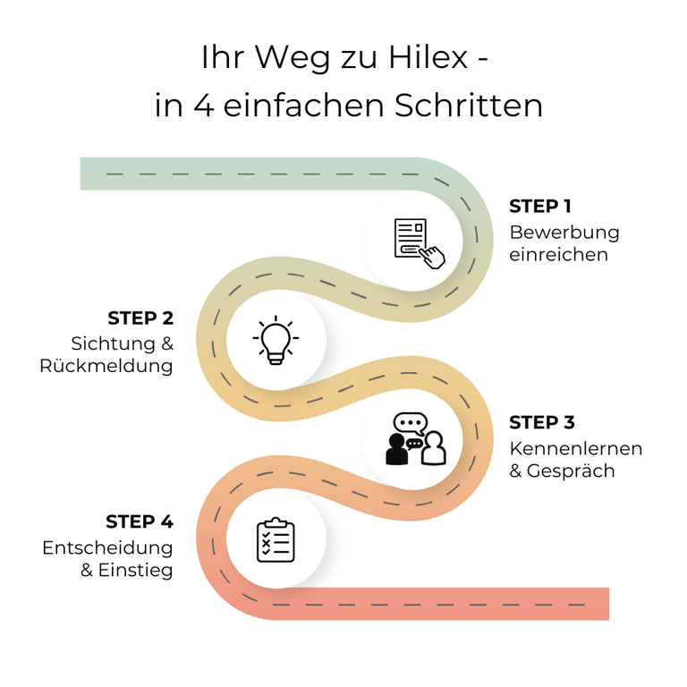 Nach dem Gespräch erhalten Sie schnellstmöglich eine Rückmeldung. Wenn alles passt, heißen wir Sie herzlich willkommen bei Hilex!